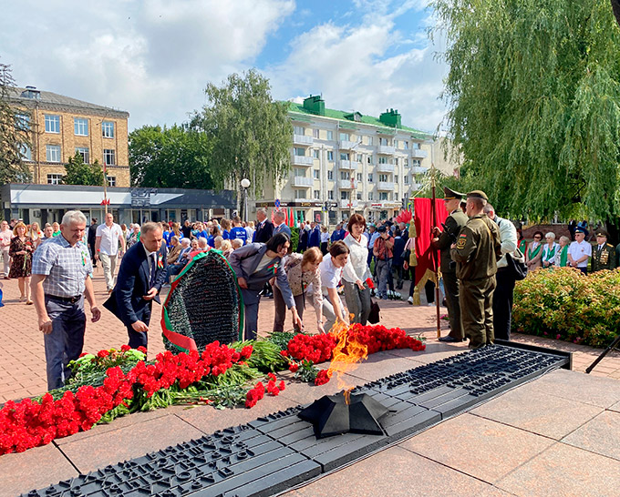 На фота: Ускладанне кветак ля помніка воінам і партызанам, якія вызвалялі г.Баранавічы