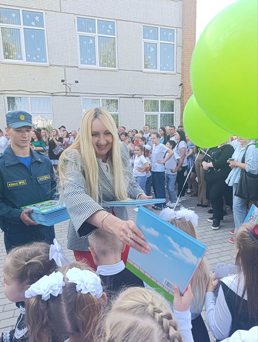 5. Дырэктар установы «Занальны дзяржаўны архіў у г.Бабруйску» Алена Заяц уручае першакласнікам кнігі ад Прэзідэнта Рэспублікі Беларусь Аляксандра Рыгоравіча Лукашэнкі «Беларусь – наша Радзіма!»