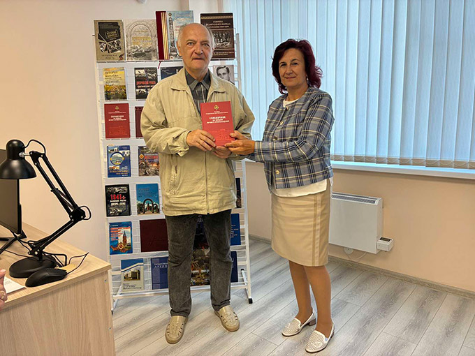 | 3. Намеснік дырэктара-галоўны захавальнік фондаў Людміла Цалабанава ўручае Вячаславу Ермаловічу даведнік па асабістых фондах архіва. |