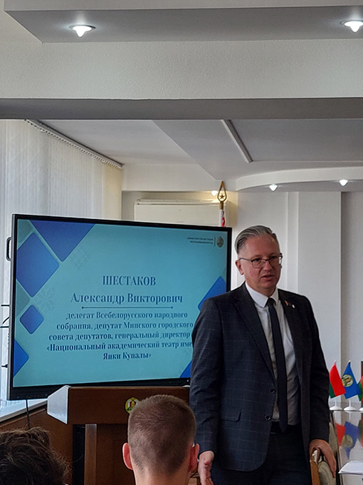 | 3. Дэпутат Мінскага гарадскога савета дэпутатаў, генеральны дырэктар дзяржаўнай установы «Нацыянальны акадэмічны тэатр імя Янкі Купалы» А.В.Шэстакоў у час выступлення. |