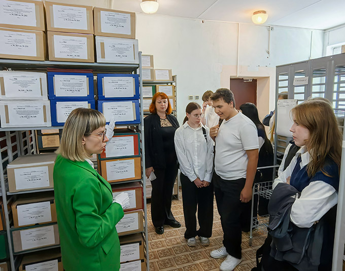 Школьнікі таксама пабывалі на агляднай экскурсіі па архіве, азнаёміліся з вітрыннымі выставамі і з умовамі захоўвання дакументаў.