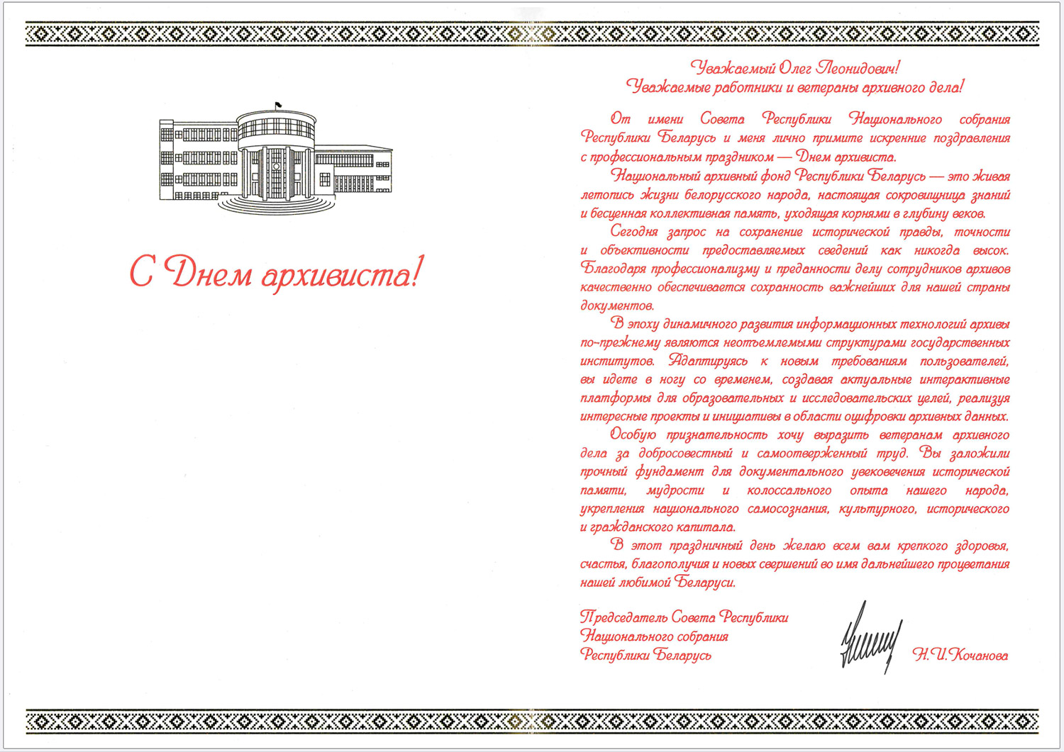 Віншаванне з Днём архівіста ад Старшыні Савета Рэспублікі Нацыянальнага сходу Рэспублікі Беларусь Н.І.Качанавай