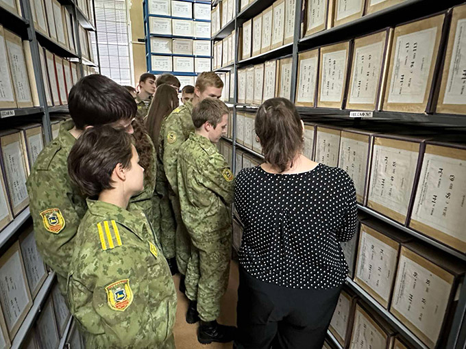 На першым уроку навучэнцам установы адукацыі «Сярэдняя школа №3 г.Гомеля імя Д.Н. Пенязькова» распавялі пра гісторыю стварэння архіва і асноўных напрамках яго працы, а ў ходзе агляднай экскурсіі па архіве, хлопцы даведаліся аб складзе і колькасці захоўваемых дакументаў і ўмовах іх захоўвання.