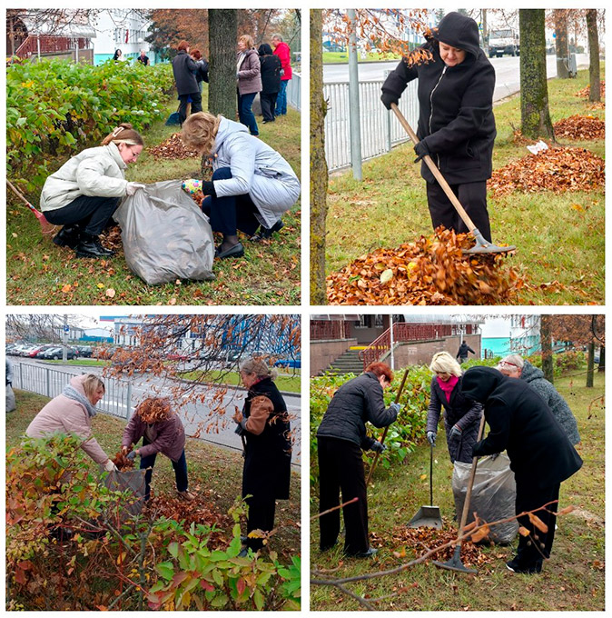| 1.Супрацоўнікі НГАБ ў г. Гродна падчас уборкі прылеглай тэрыторыі ўстановы. |