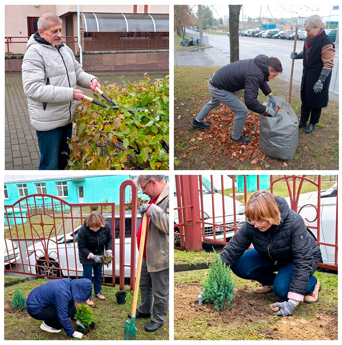 | 2.Супрацоўнікі НГАБ ў г. Гродна падчас уборкі прылеглай тэрыторыі ўстановы і пасадкі дэкаратыўных кустоў. |