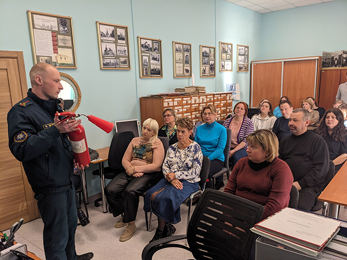 У ходзе маніторынгу работнікам устаноў «Беларускі дзяржаўны архіў навукова-тэхнічнай дакументацыі» і «Беларускі дзяржаўны архіў-музей літаратуры і мастацтва» была прачытана лекцыя аб асновах пажарнай бяспекі і правілах паводзін ва ўмовах узнікнення ўзгаранняў.