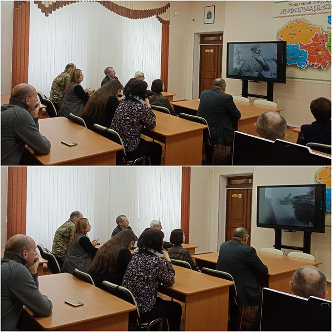 Загадчык аддзела выкарыстання дакументаў Нікуліна Марыя правяла кіналекторый перад паказам фільма «Гісторыя Вялікай Перамогі», падрыхтаваны Беларускім дзяржаўным архівам кінафотафонадакументаў.