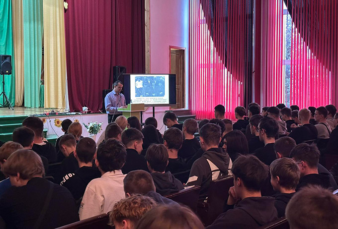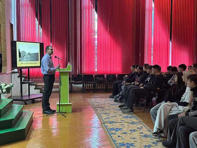 | 1-2. Вядучы археограф ЗДА ў г.Рэчыцы С.А.Жарносенка расказвае навучэнцам Рэчыцкага тэхкаледжа аб аднаўленні сельскай гаспадаркі Рэчыцкага раёна пасля Вялікай Айчыннай вайны |