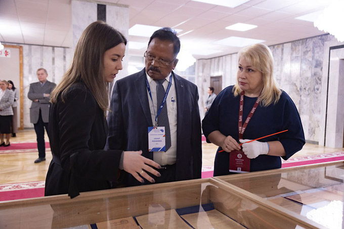 | 7. Загадчык аддзела НАРБ М.А.Старасценка знаёміць з выставай віцэ-прэзідэнта Усеіндыйскага кангрэса прафсаюзаў Махамеда Юсуфа |