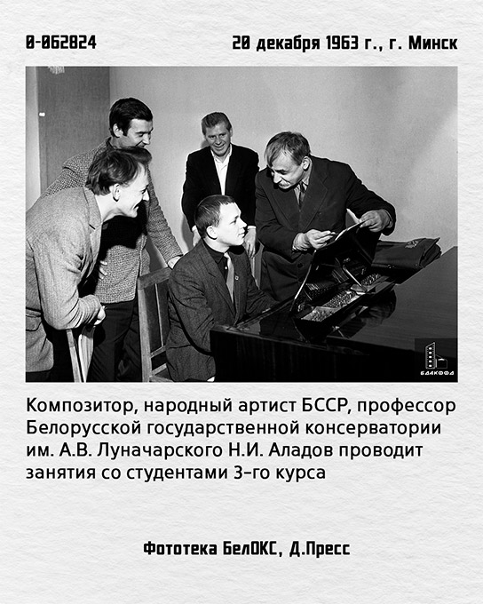 | 12. 0-062824 Кампазітар, народны артыст БССР, прафесар Беларускай дзяржаўнай кансерваторыі імя А.У.Луначарскага М.І.Аладаў праводзіць заняткі са студэнтамі 3-га курса 20 снежня 1963 г., г.Мінск, Фотатэка БелАКС, Д.Прэс |
