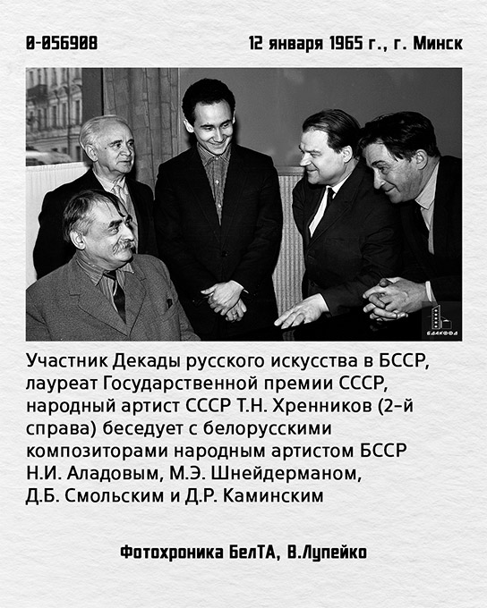 | 14. 0-056908 Удзельнік Дэкады рускага мастацтва ў БССР, лаўрэат Дзяржаўнай прэміі СССР, народны артыст СССР Т.М.Хрэннікаў (2-і справа) гутарыць з беларускімі кампазітарамі, народным артыстам БССР Н.І.Аладавым, М.Э.Шнейдэрманам. студзеня 1965 г., г.Мінск, Фотахроніка БелТА, В.Лупейка |