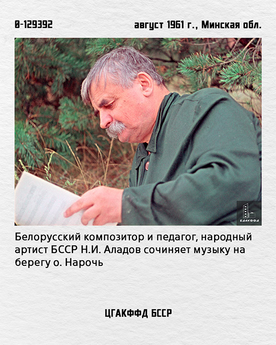 | 9. 0-129392 Беларускі кампазітар і педагог, народны артыст БССР Н.І.Аладаў піша музыку на беразе а.Нарач Жнівень 1961г., Мінская вобл. |