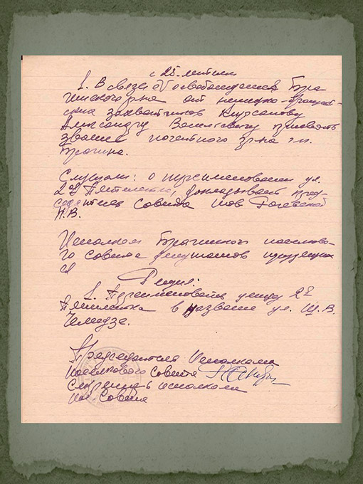 Занальны дзяржаўны архіў у г.Рэчыцы прадстаўляе дакумент аб прысваенні вуліцы г.п.Брагіна імя ўдзельніка Вялікай Айчыннай вайны Ш.У.Чалідзэ