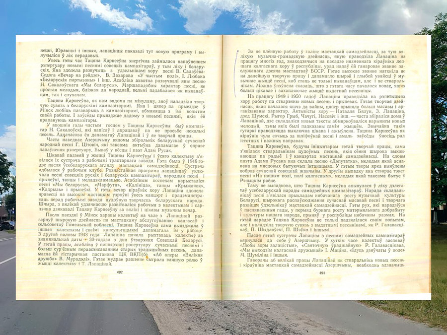У ліку дакументаў фонда Таццяны Лапацінай – нарыс Алеся Есакова «Хор Лапацінай» (Ф. 885. Воп. 1. Спр. 12. Арк. 50-54) з энцыклапедыі «Жанчыны Савецкай Беларусі», выданай у 1954 годзе. У нарысы апавядаецца аб жыцці і працы Таццяны Карнееўны, аб творчай дзейнасці створанага ёю Азершчынскага народнага хору – ад першага выступлення на Рэчыцкім радыё ў жніўні 1936 года да гастролей у розных кутках СССР, аб падборы салістаў і рэпертуара, аб супрацоўніцтве Лапацінай са знакамітымі кампазітарамі і музыкантамі.
