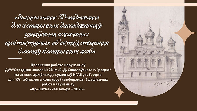 Установа «Нацыянальны гістарычны архіў Беларусі ў г.Гродна» прадстаўляе прэзентацыю да праектнай працы «Выкарыстанне 3-Д мадэлявання для гістарычных даследаванняў: узнаўлення згубленых архітэктурных аб’ектаў, стварэння бюстаў гістарычных асоб».
