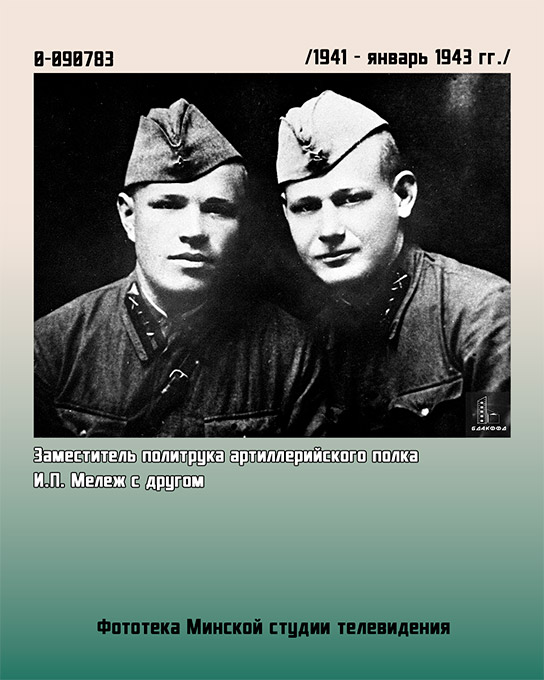 | 1. 0-090783 Намеснік палітрука артылерыйскага палка І.П.Мележ з сябрам /1941– студзень 1943 гг./. Фотатэка Мінскай студыі тэлебачання |