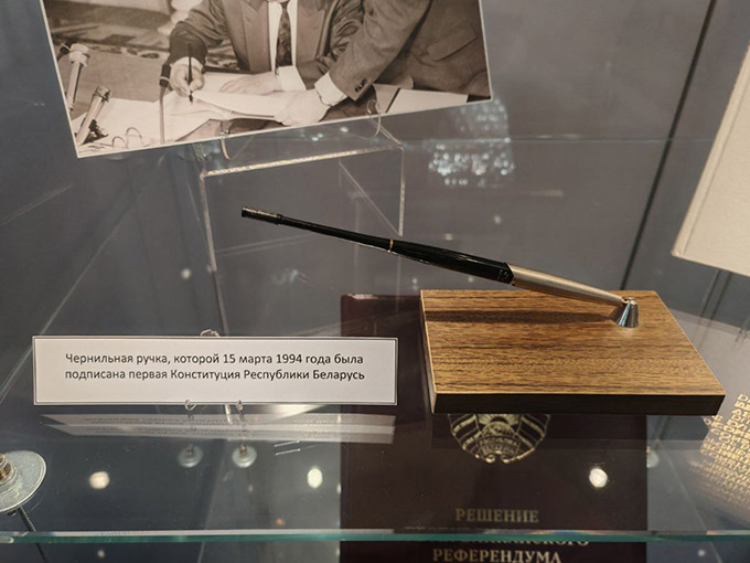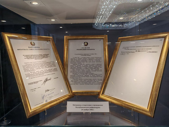 Нацыянальны архіў Рэспублікі Беларусь прадаставіў на выставу копіі архіўных дакументаў: Закон Рэспублікі Беларусь ад 15 сакавіка 1994 года «Аб парадку ўступлення ў сілу Канстытуцыі Рэспублікі Беларусь», пратаколы пасяджэння рабочай групы Канстытуцыйнай камісіі Вярхоўнага Савета БССР, Пастанову Вярхоўнага Савета Рэспублікі Беларусь «Аб правядзенні рэспубліканскага рэферэндуму ў Рэспубліцы Беларусь і мерах па яго забеспячэнні», пратаколы Цэнтральнай камісіі Рэспублікі Беларусь па выбарах і правядзенні рэспубліканскіх рэферэндумаў, і іншыя дакументы. У экспазіцыі таксама можна азнаёміцца з друкаванымі выданнямі са збору Прэзідэнцкай бібліятэкі Рэспублікі Беларусь і матэрыяламі з фондаў Нацыянальнага гістарычнага музея Рэспублікі Беларусь, а таксама з падарункамі замежных дэлегацый.