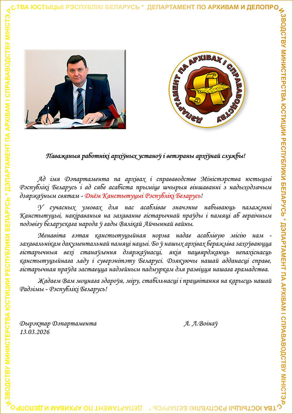Віншаванне дырэктара Дэпартамента па архівах і справаводстве Міністэрства юстыцыі Рэспублікі Беларусь з Днём Канстытуцыі Рэспублікі Беларусь