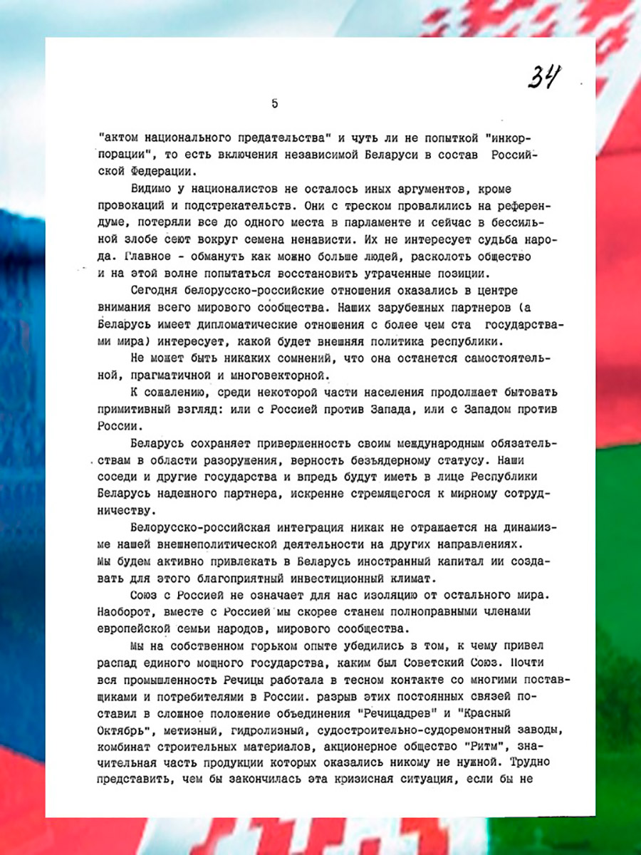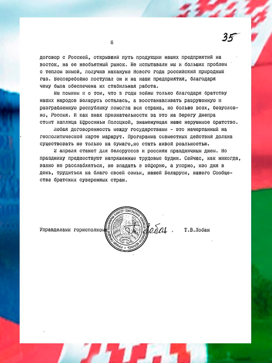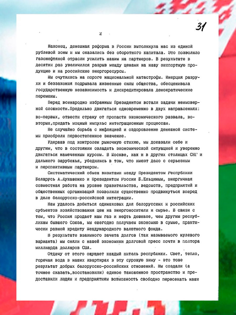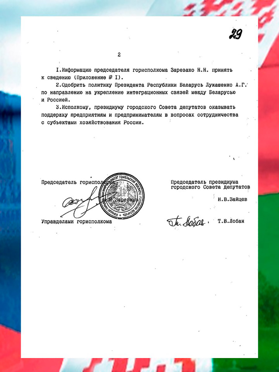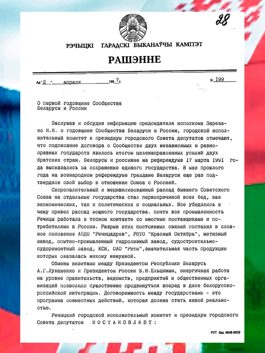 Занальны дзяржаўны архіў у г.Рэчыцы прадстаўляе дакументы аб Саюзе Беларусі і Расіі