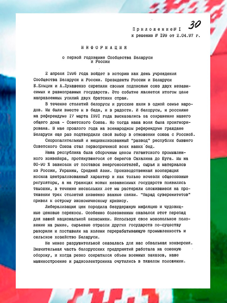 30 гадоў таму, 2 красавіка 1996 года, адбылася важная для гісторыі нашай краіны падзея: прэзідэнтамі Беларусі і Расіі, Аляксандрам Лукашэнкам і Барысым Ельцыным, быў падпісаны Дагавор аб стварэнні Супольніцтва Беларусі і Расіі, накіраваны на цесную інтэграцыю і супрацоўніцтва абедзвюх брацкіх дзяржаў адна з адной. У далейшым 2 красавіка стала штогод адзначацца як Дзень яднання народаў Беларусі і Расіі.