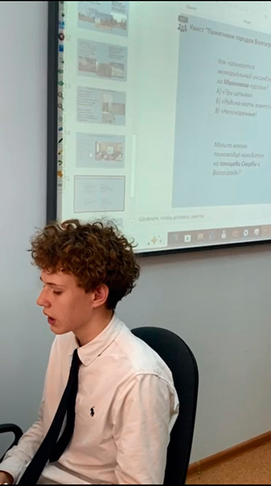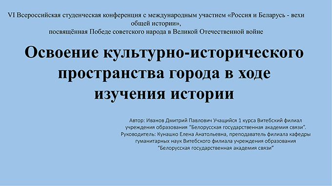 | 1-3. Дзмітрый Іваноў, навучэнец Віцебскага філіяла УА «БДАС», на VI Усерасійская студэнцкая канферэнцыя з міжнародным удзелам «Расія і Беларусь – вехі агульнай гісторыі» распавядае аб засваенні ім і яго сябрамі культурна-гістарычнай прасторы горада Віцебска. |