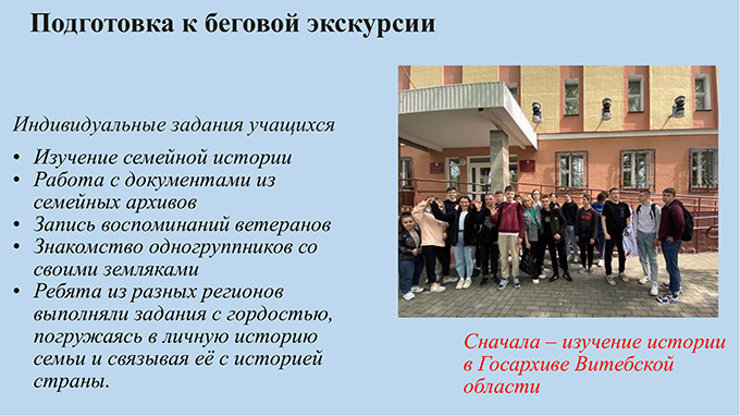 Экспертная рада ацэньвала працы 200 удзельнікаў з 28 суб’ектаў Расійскай Федэрацыі, 4 абласцей Беларусі і сталіцы В’етнама – Ханой. У спісе пераможцаў Дзмітрый Іваноў, навучэнец гурта ТК 511, праца якога была прысвечана вывучэнню гісторыі Віцебска. У працы знайшло адлюстраванне шматгадовае супрацоўніцтва філіяла і Дзяржархіва Віцебскай вобласці ў рамках рэспубліканскай акцыі «Архівы – школе».