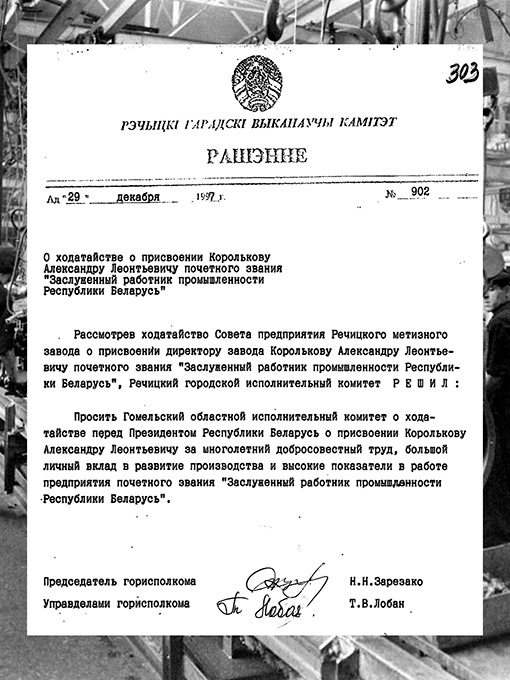 Рассмотрев ходатайство Совета предприятия Речицкого метизного завода, 29 декабря 1997 года Речицкий горисполком принял решение №902 (Ф. 342. Оп. 1. д.245. Л. 303) следующего содержания: «Просить Гомельский областной исполнительный комитет о ходатайстве перед Президентом Республики Беларусь о присвоении Королькову Александру Леонтьевичу за многолетний добросовестный труд, большой личный вклад в развитие производства и высокие показатели в работе предприятия почетного звания «Заслуженный работник промышленности Республики Беларусь». В итоге в 1998 году директор Речицкого метизного завода А.Л.Корольков был удостоен этого звания.