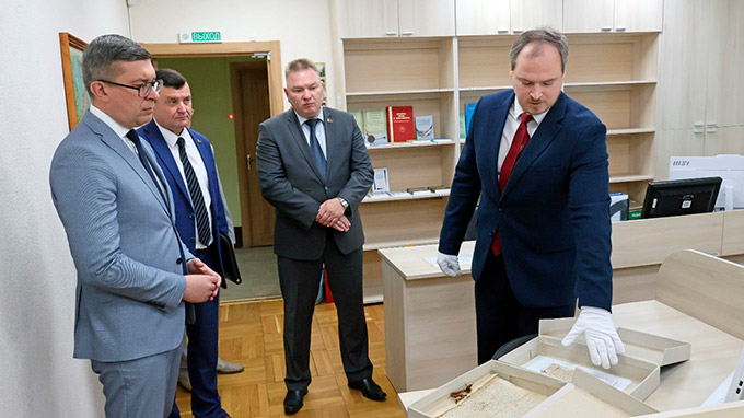 В НИАБ руководителю ведомства продемонстрировали уникальные документы, хранящиеся в фондах, рассказали об истории учреждения и ключевых направлениях его деятельности. Особое внимание было уделено проводимой работе по сохранению историко-документального наследия страны. В Институте документоведения и архивного дела Евгения Коваленко ознакомили с основными тематиками научно-исследовательских работ учреждения. Кроме того, Министр осмотрел объект капитального ремонта, проверив ход строительных работ и их соответствие утверждённым планам.