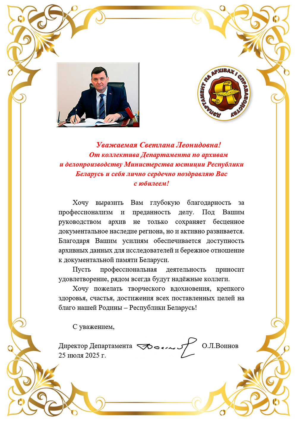 Поздравление с юбилеем директору учреждения «Государственный архив Могилевской области» Светлане Леонидовне Шараевой от Директора Департамента по архивам и делопроизводству Министерства юстиции Республики Беларусь О.Л.Воинова