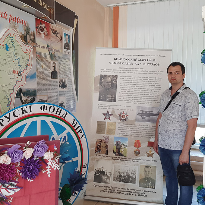 | 3. Ведущий археограф ЗГА в г.Речице С.А. Жарносенко около баннера, посвященного Герою Советского Союза А.В. Козлову, в Лоевской средней школе им. А.В. Козлова |