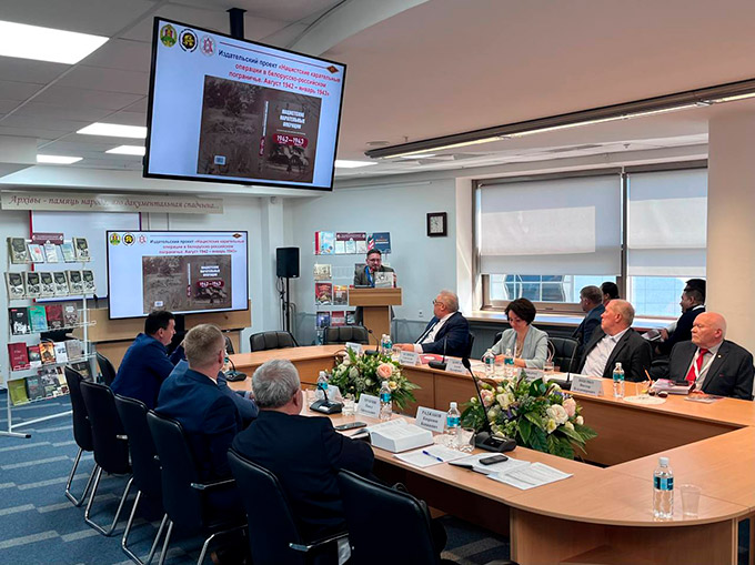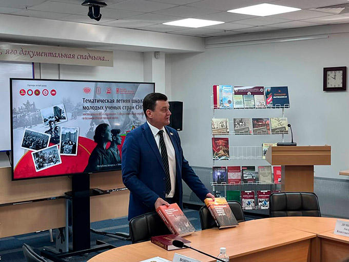 Слушателям школы был продемонстрирован киноролик «Мы помним, мы гордимся…», подготовленный архивистами к 80-летию Победы с применением технологии искусственного интеллекта. От архивной отрасли Беларуси с научным докладом «Фонды Национального архива Республики Беларусь по истории Великой Отечественной войны как источник изучения геноцида белорусского народа» выступил заместитель директора НАРБ, к.и.н. С.В.Кулинок.
