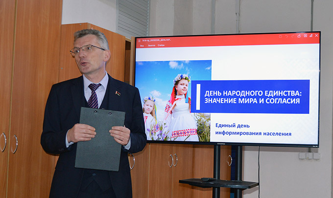 В рамках Единого дня информирования, в ходе презентации на тему «День народного единства: значение мира и согласия» участники собрания обсудили коренные социально-экономические преобразования, произошедшие после воссоединения Западной Беларуси с БССР, а также достижения единой и независимой Беларуси на современном этапе.