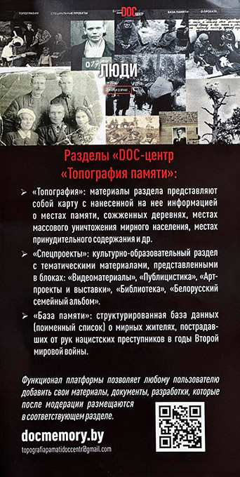 Онлайн-ресурс создан Мастерской инновационных технологий для увековечения памяти мирных жителей Гомельской области, пострадавших от рук нацистских преступников в годы Второй мировой войны, формирования в регионе культуры памяти и способности к осмыслению, изучению и преломлению через человеческие судьбы событий военного времени.