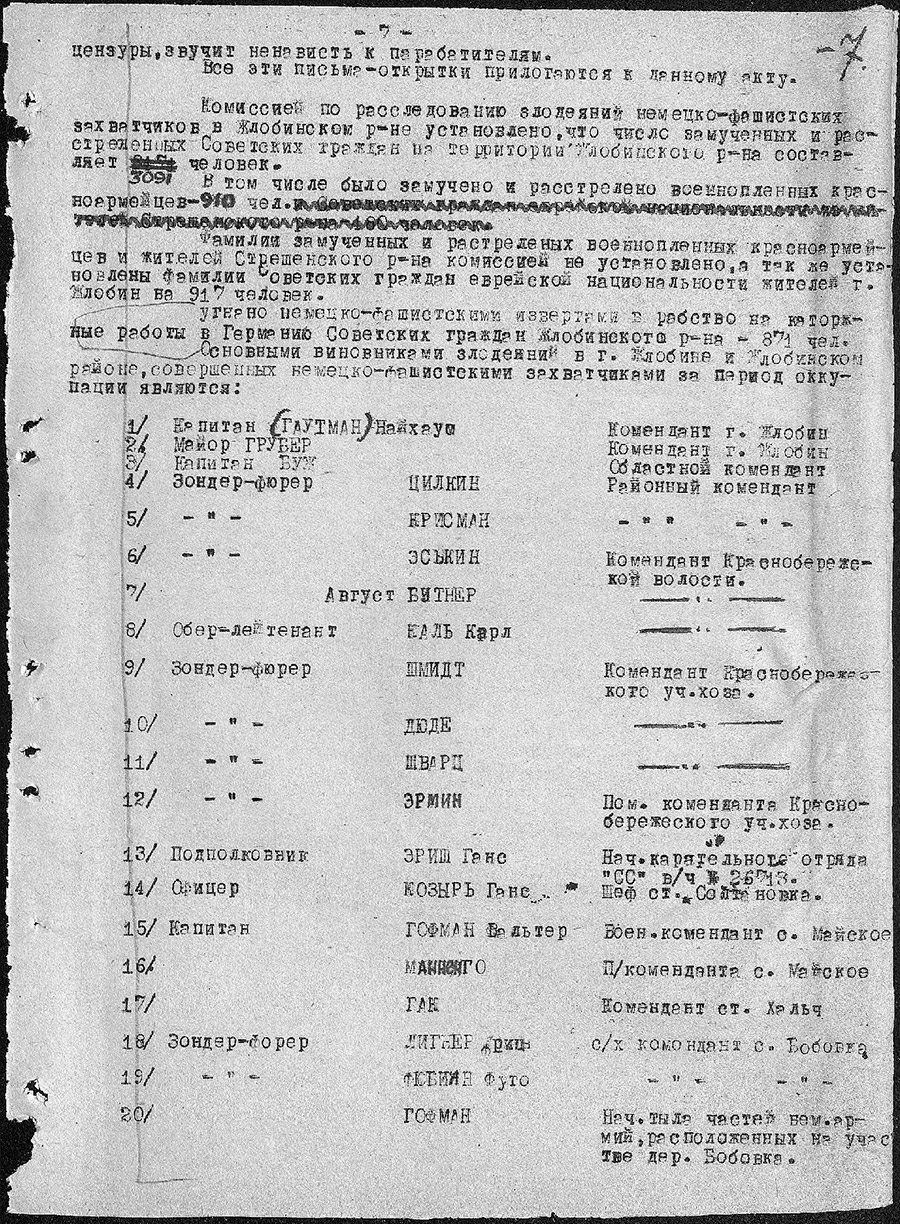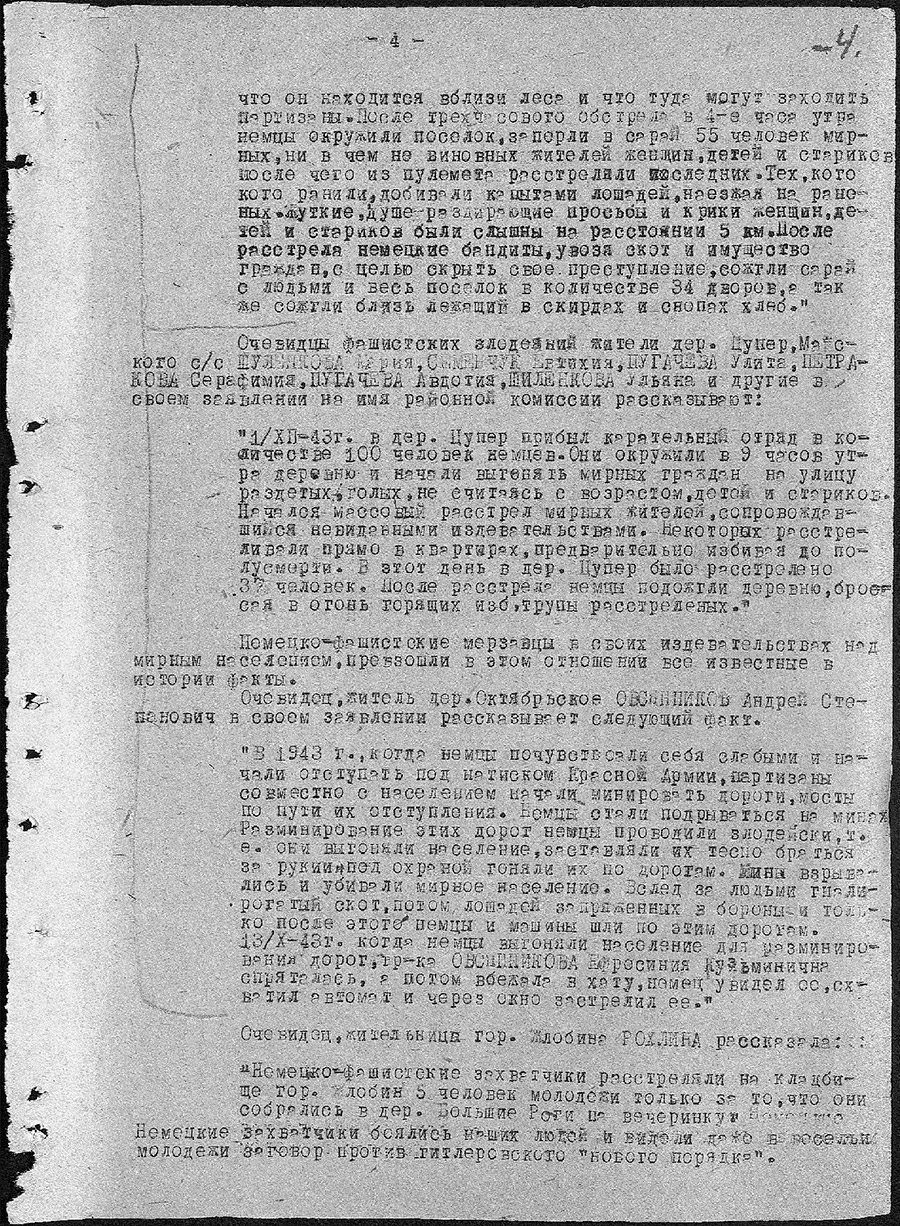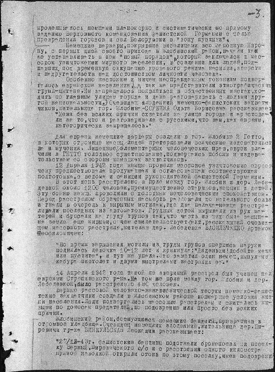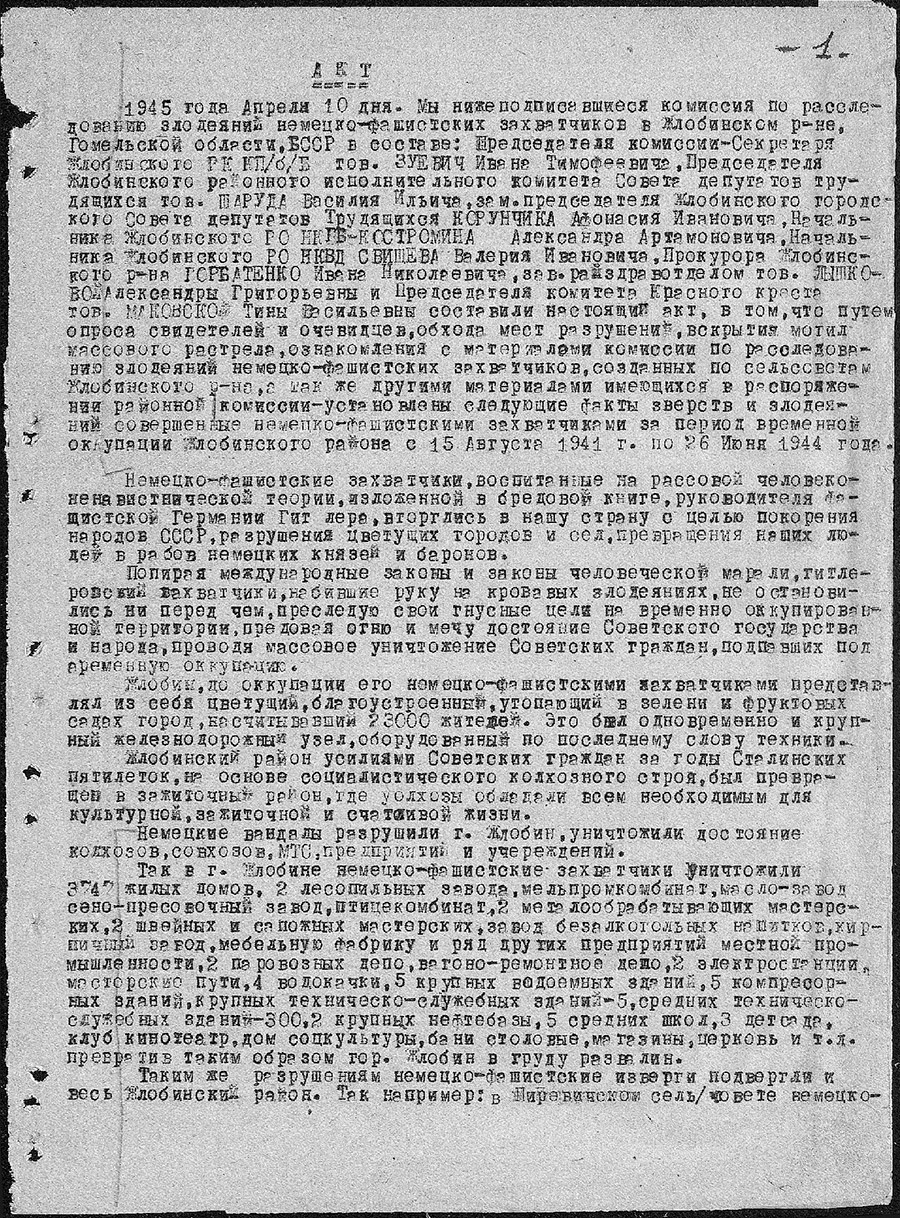 Учреждение «Зональный государственный архив в г.Жлобине» в рамках рубрики «Малоизвестные документы по истории Великой Отечественной войны» представляет цифровые копии архивных документов фонда «Коллекция цифровых копий на правах подлинников документов Чрезвычайной государственной комиссии по установлению и расследованию злодеяний немецко-фашистских захватчиков и их сообщников и причиненного ими ущерба»: акт установления фактов зверств и злодеяний, совершенных немецко-фашистскими захватчиками за период временной оккупации Жлобинского района с 15 августа 1941 года по 26 июня 1944 года.