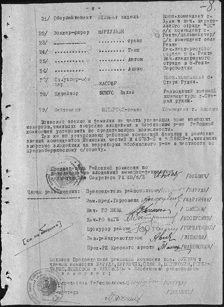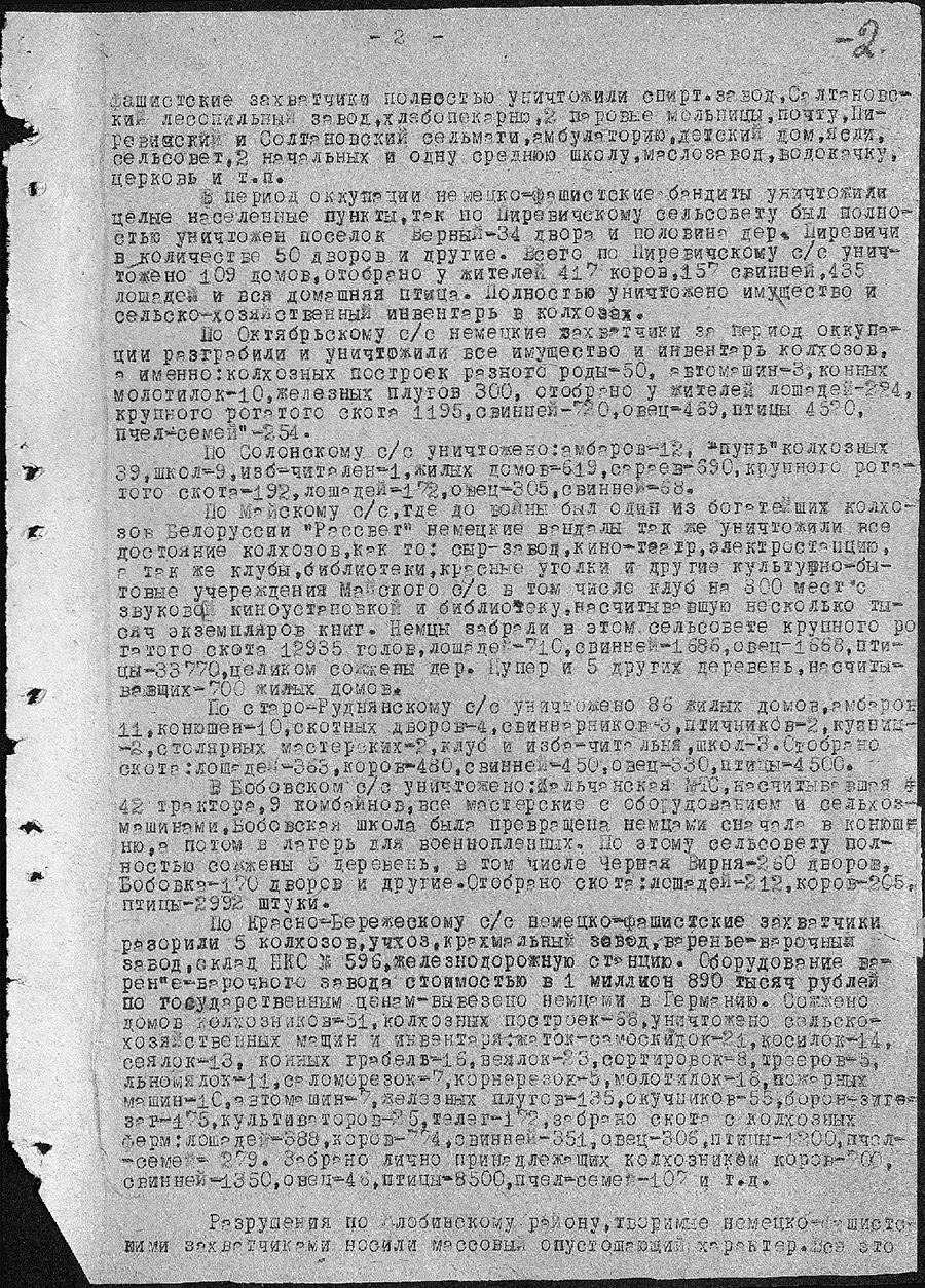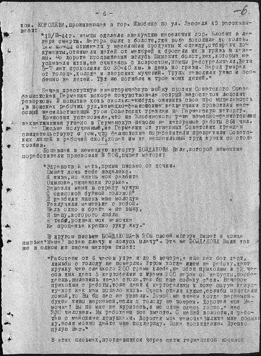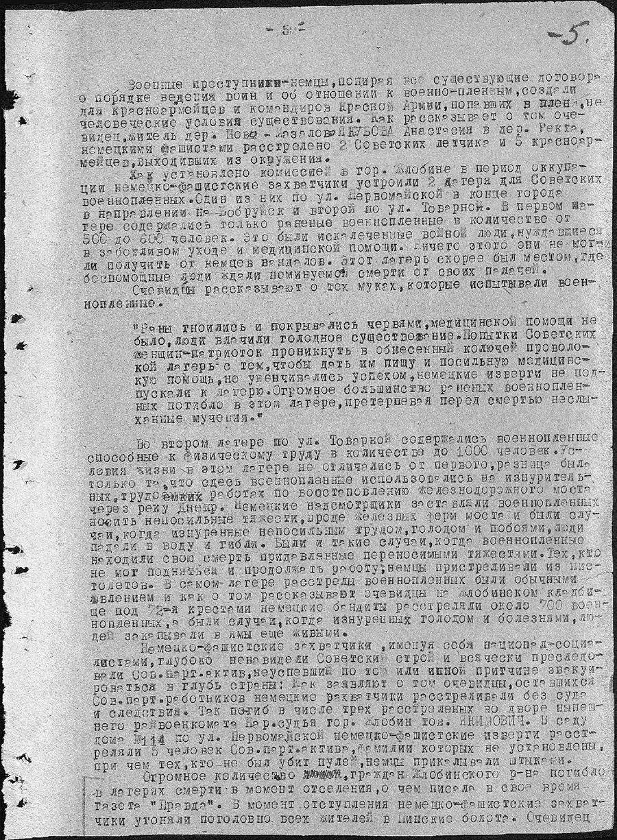 Учреждение «Зональный государственный архив в г.Жлобине» в рамках рубрики «Малоизвестные документы по истории Великой Отечественной войны» представляет цифровые копии архивных документов фонда «Коллекция цифровых копий на правах подлинников документов Чрезвычайной государственной комиссии по установлению и расследованию злодеяний немецко-фашистских захватчиков и их сообщников и причиненного ими ущерба»: акт установления фактов зверств и злодеяний, совершенных немецко-фашистскими захватчиками за период временной оккупации Жлобинского района с 15 августа 1941 года по 26 июня 1944 года.