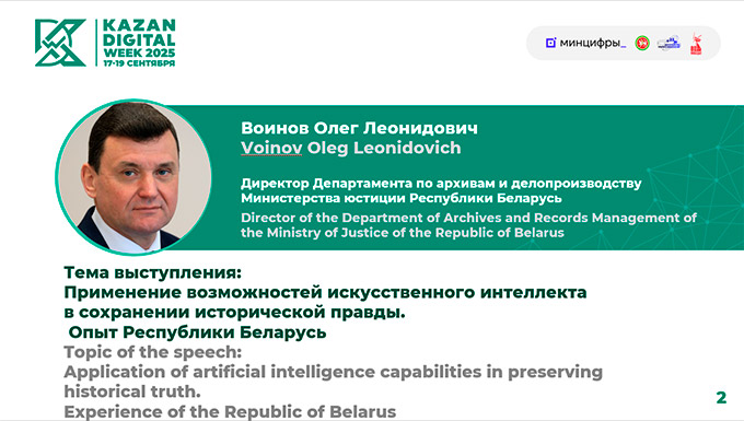 18 сентября 2025 г. директор Департамента по архивам и делопроизводству Министерства юстиции Республики Беларусь Воинов Олег Леонидович выступил на международном форуме Kazan Digital Week