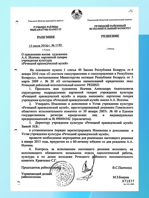 Зональный государственный архив в г.Речице представляет документ о присвоении картинной галерее Речицкого краеведческого музея имени Александра Исачёва