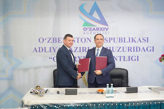 В Агентстве «Узархив» при Министерстве юстиции Республики Узбекистан (г.Ташкент) состоялась торжественная церемония подписания Плана совместных действий по развитию сотрудничества между архивными учреждениями Республики Беларусь и Республики Узбекистан на 2025–2027 годы. Под документом свои подписи поставили директор Агентства «Узархив» при Министерстве юстиции Республики Узбекистан Улугбек Мирталибович Юсупов и директор Департамента по архивам и делопроизводству Министерства юстиции Республики Беларусь Олег Леонидович Воинов.