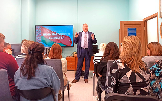В рамках мероприятия выступил приглашённый спикер Сергей Сергеевич Александрович, кандидат исторических наук, доцент исторического факультета Белорусского государственного университета. Лекция была посвящена историческому значению Дня народного единства, его роли в формировании национального самосознания белорусов и важности сохранения единства и согласия в современном обществе. Выступление охватило ключевые аспекты этого праздника, включая его исторические предпосылки, значение событий 17 сентября для Беларуси, роль национального единства в развитии страны и актуальность сохранения исторической памяти и традиций.