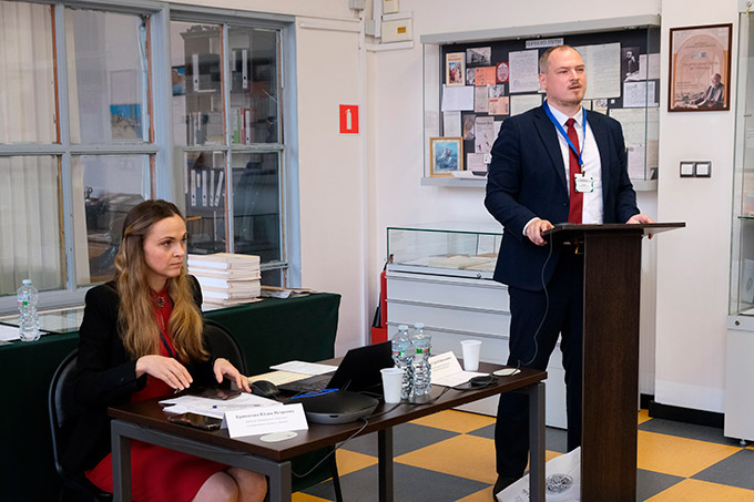 | 4. Директор Ленинградского областного архива в г.Выборге Юлия Крипатова и заместитель директора НИА Беларуси Сергей Рындин – ведущие тематической площадки «Использование архивных документов. Опыт подготовки сборников архивных документов и реализация архивами выставочных проектов» |