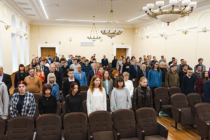 | 3. Участники пленарного заседания Пичетовских чтений – 2025 во время исполнения Гимна Республики Беларусь |
