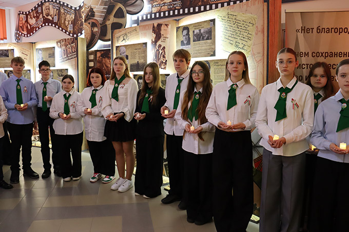 Старший научный сотрудник Мая Ващенко рассказала учащимся о том, как был разминирован Гомель после освобождения. Ученикам был продемонстрирован документальный фильм БГАКФФД об освобождении Гомеля. Участники мероприятия почтили Память погибших в Великой Отечественной войне минутой молчания.