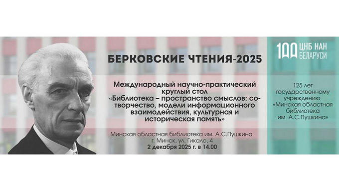 2 декабря 2025 г. в Минской областной библиотеке им.А.С.Пушкина состоялся международный научно-практический круглый стол «Библиотека – пространство смыслов: со-творчество, модели информационного взаимодействия, культурная и историческая память», посвященный 125-летию государственного учреждения «Минская областная библиотека им. А.С.Пушкина». Мероприятие прошло в рамках международной научно-практической конференции «Берковские чтения – 2025», прошедшей на базе Центральной научной библиотеки им. Якуба Коласа НАН Беларуси.