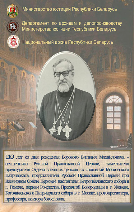 18 января 2025 года исполняется 110 лет со дня рождения Борового Виталия Михайловича — священника Русской Православной Церкви, заместителя председателя Отдела внешних церковных сношений Московского Патриархата, представителя Русской Православной Церкви при Всемирном Совете Церквей, настоятеля Петропавловского собора в г.Гомеле, церкви Рождества Пресвятой Богородицы в г.Женеве, Богоявленского Патриаршего собора в г.Москве, протопресвитера, профессора, доктора богословия.