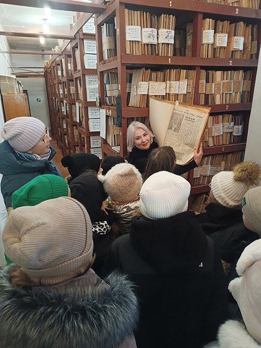 На фото: Виктория Кондратенко при проведении тематической беседы «Пока мы помним – мы живем», презентации стендовой выставки «Афганистан — память в лицах» и проведении экскурсии по архивохранилищу.