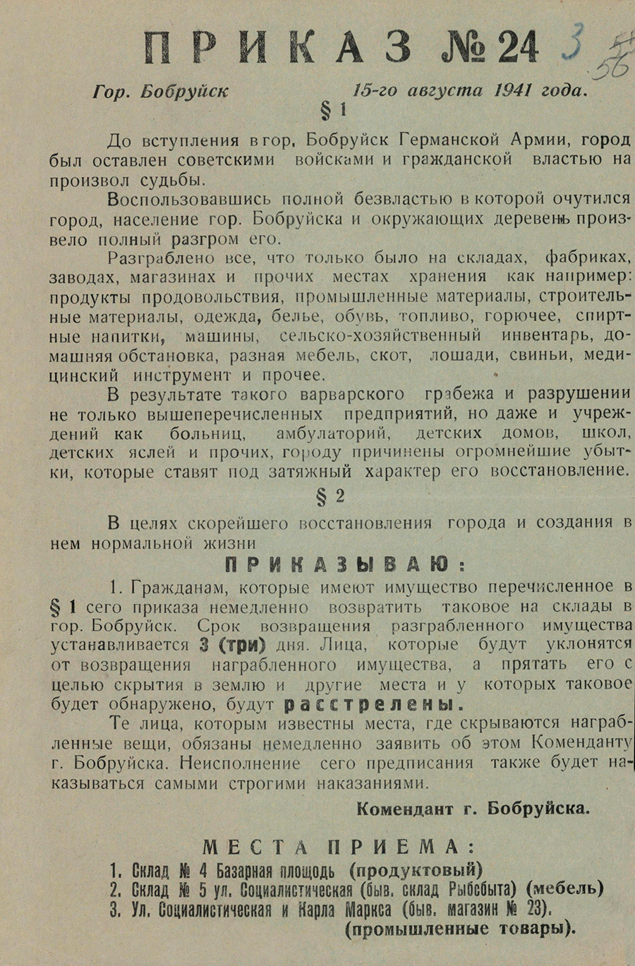 | 1. Приказ коменданта г.Бобруйска от 15 августа 1941 года №24 о возврате награбленного имущества (Ф. 858 Оп. 1 д.19 Л. 56). |