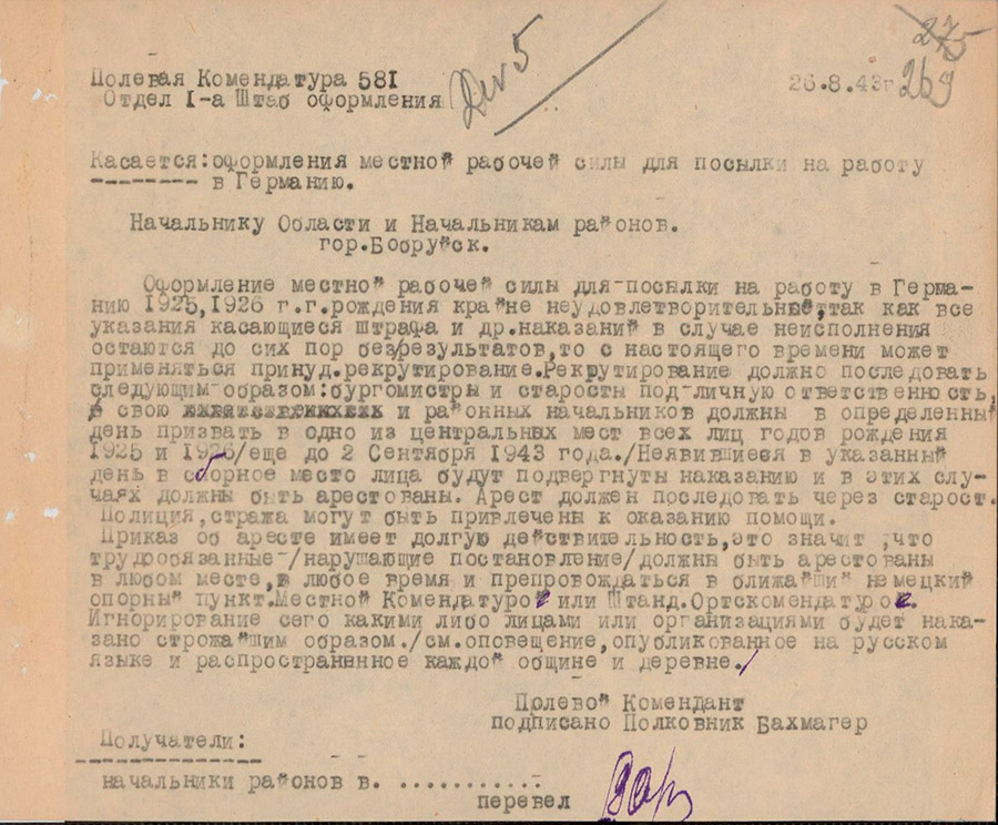 | 2. Приказ полевой комендатуры №851 от 26 августа 1943 года об оформлении местной рабочей силы для отправки на работу в Германию (Ф. 858 Оп. 1 Д. 23 Л. 269). |