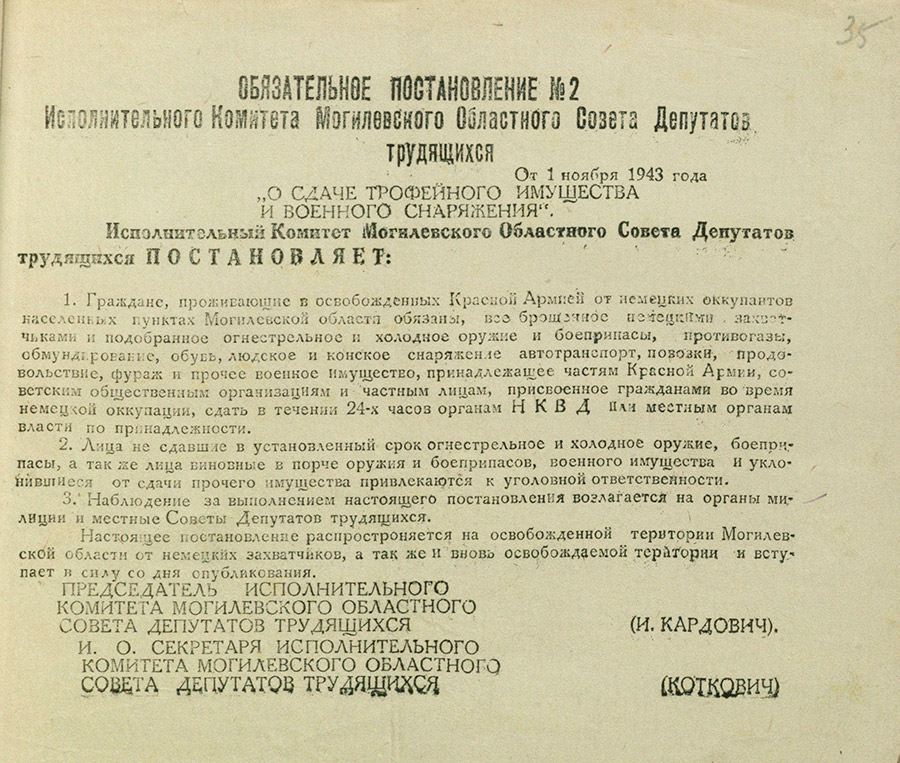 | 3. Обязательное Постановление исполнительного комитета Могилевского областного Совета депутатов трудящихся от 1 ноября 1943 года №2 «О сдаче трофейного имущества и военного снаряжения» (Ф. 11 Оп. 2 д.3 Л. 35). |