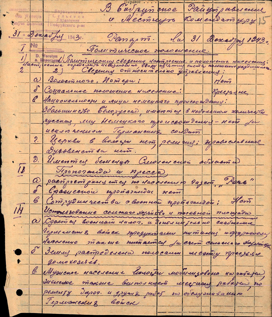 | 4-5. Рапорт бургомистра Воротынского сельского управления от 31 декабря 1943 года о положении дел (Ф. 859 Оп. 1 д.6 Л. 15-15 об.). |