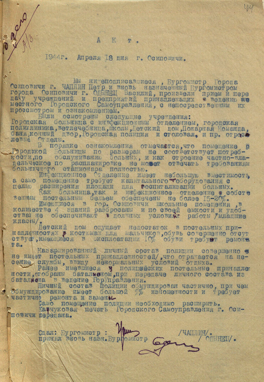 | 6. Акт приема-передачи должности бургомистра города Осиповичи от 18 апреля 1944 года (Ф. 845 Оп. 2 д.1 Л. 44). |
